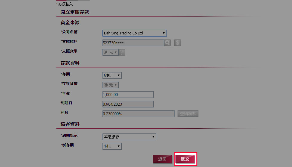 核對指示資料,並按「確定」以完成遞交指示。